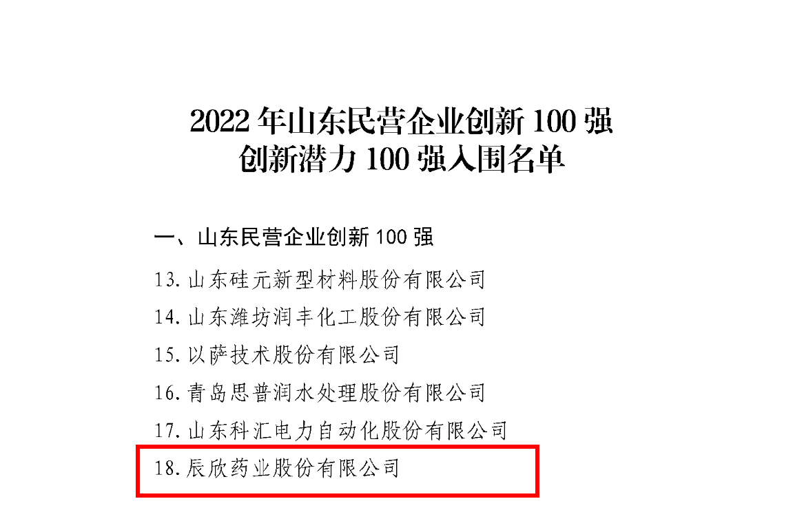 近日,山东省工商联网站发布通告,公示了2022年山东民营企业行业领军10强、创新100强、创新潜力100强、吸纳就业100强入围名单。辰欣药业荣登“医养健康行业领军十强”及“山东省创新百强企业”。